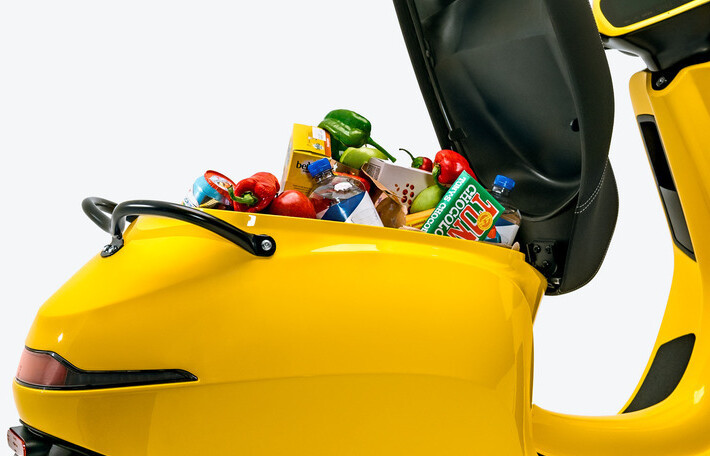 பின் இருக்கையின் கீழ் மிகப்பெரிய சேமிப்பு இடம் உள்ளது. ஒரு முழு பியர் கிரேட்டை, இரண்டு பெரிய மளிகைப் பைகளை அல்லது இரண்டு முழு தலைக்கவசங்களைச் சேமிக்கலாம்.