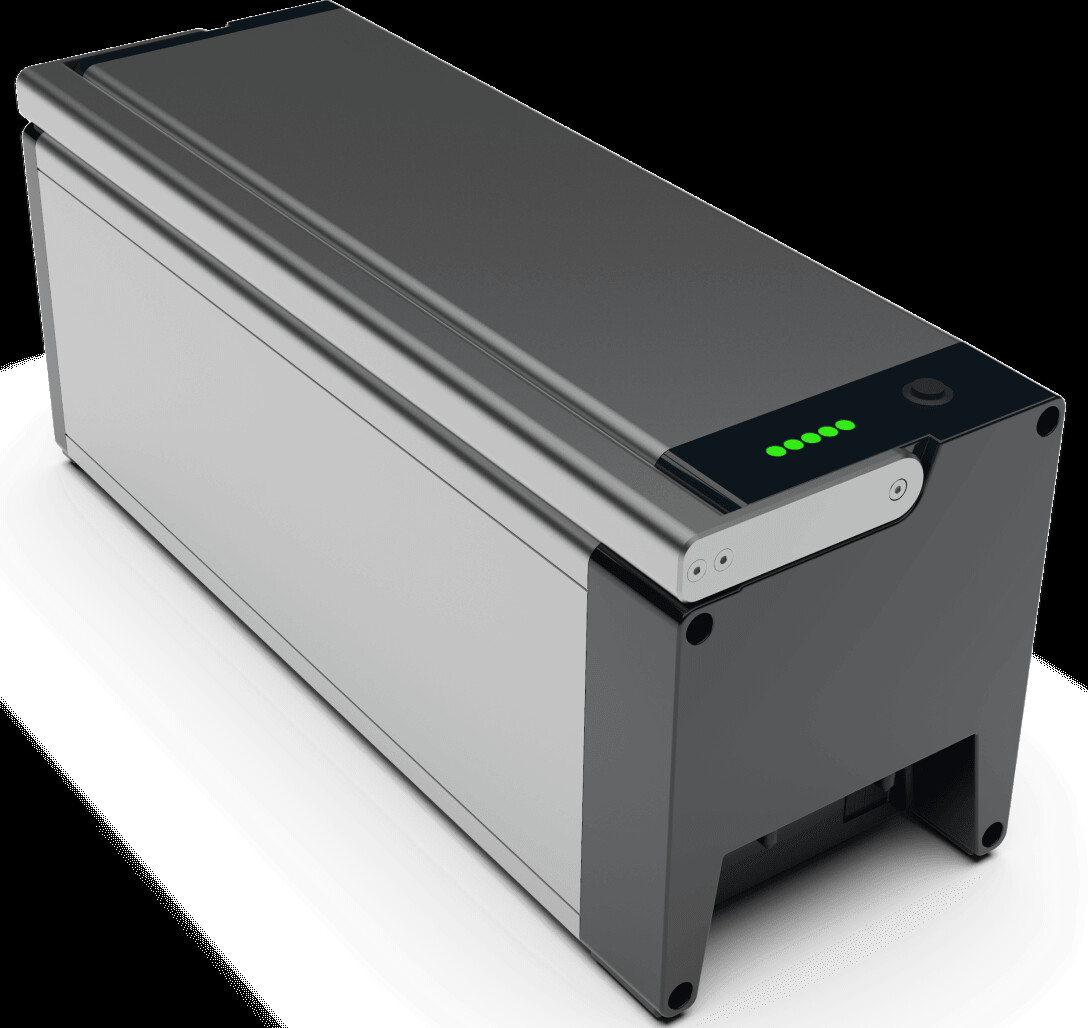 The moped has a high quality swap-able 39 ஆம்பியர் மணி lithium battery that provides a driving range of 80 கிமீ. The battery is of the same type as the batteries used in the latest Tesla cars. The battery provides 48 km range with a 1 hour charge.