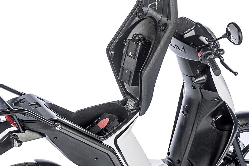 The scooter has two removable Lithium batteries that provide a range of 110 கிமீ. The batteries can be charged in 240 நிமிடங்கள்.